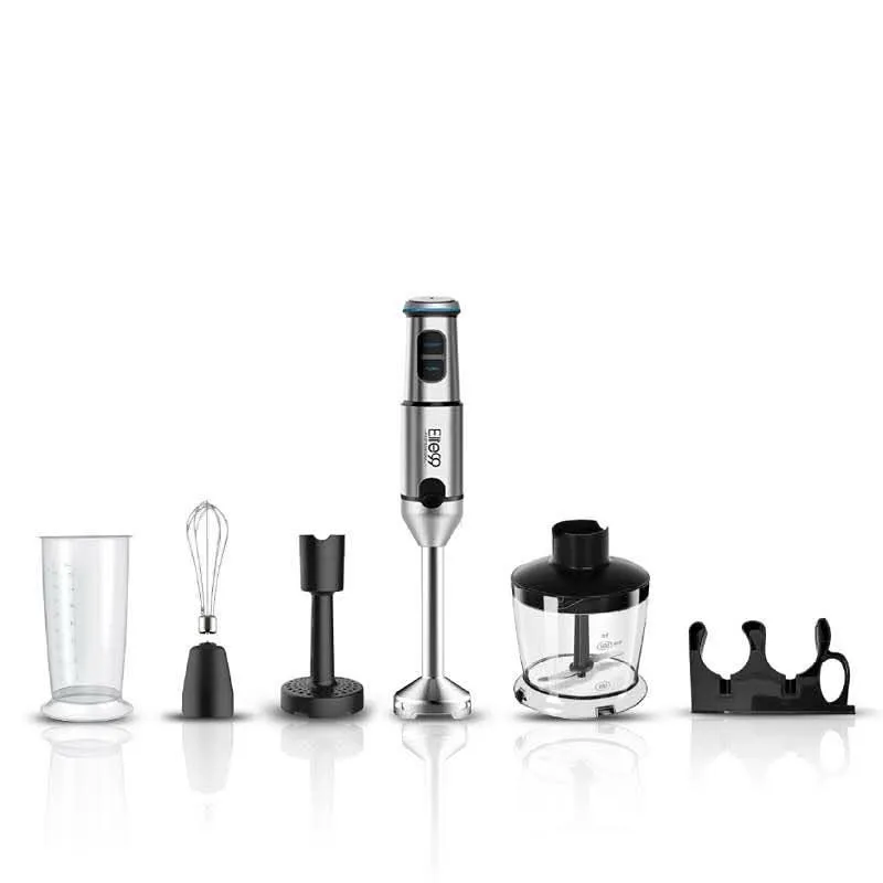 Préparez facilement toutes vos recettes avec ce mixeur plongeant 6 en 1, conçu pour mixer, fouetter, hacher, émincer, mélanger et réduire en purée.